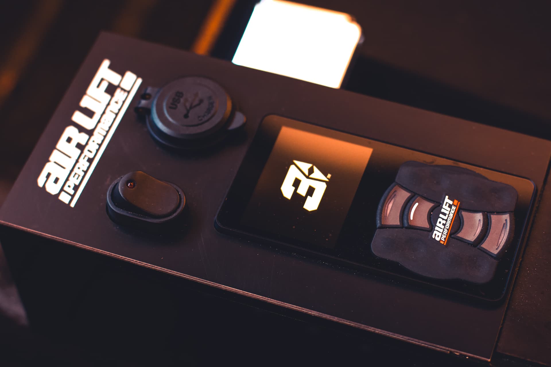 In the center console, you’ll find Air Lift Performance’s 3P air management system nestled in, controlling custom air springs on each corner.
