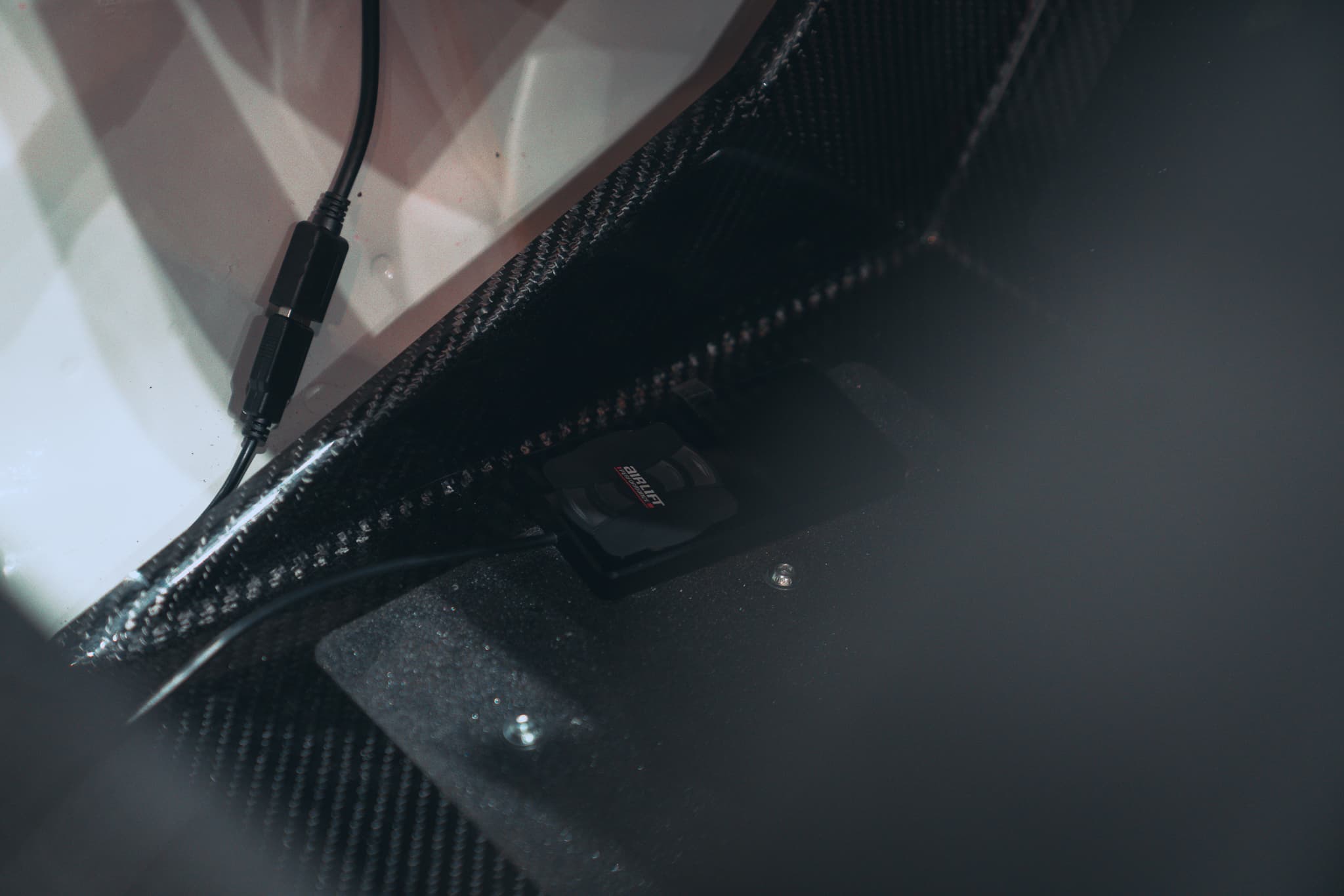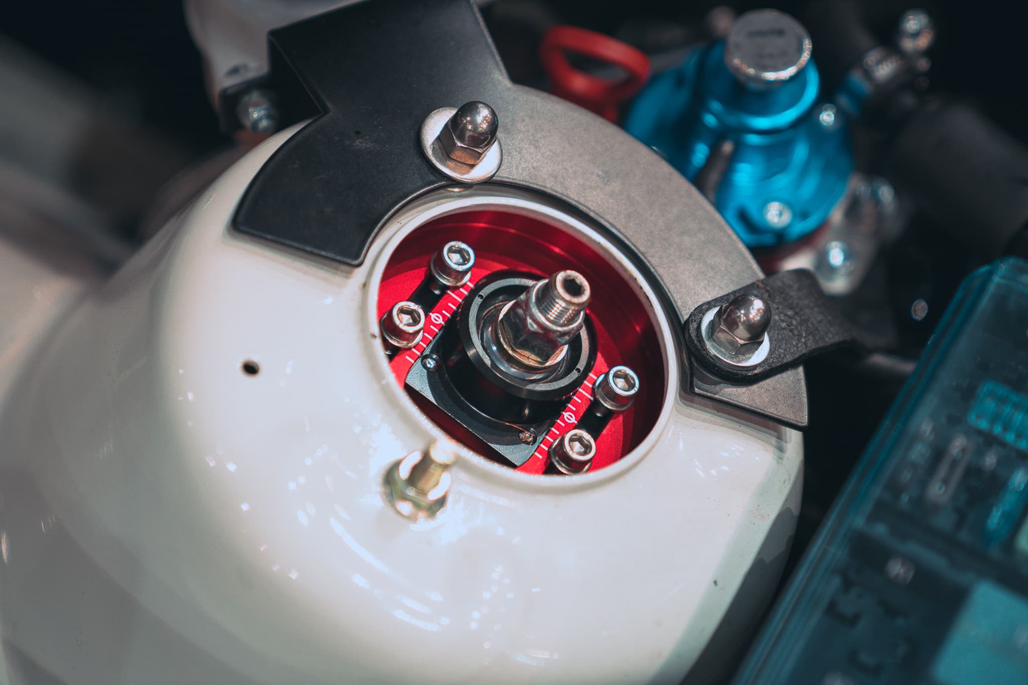 Air Lift Performance threaded body struts and air management allow Fabian to lift the car at the touch of a button and dial in his stance and ride height to perfection. The red anodizing on the Air Lift Performance top mounts even matches the red accents on the car!