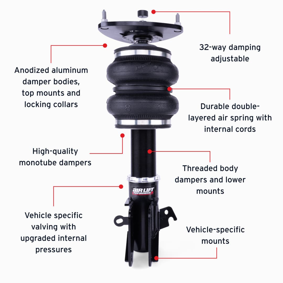 Lower your Subaru Wrx or Wrx Sti and raise your standards to Air Lift Performance. The front kit features progressive-rate, double-bellows air springs placed over high-performance monotube struts. With 32 levels of damping adjustability, camber plates in the upper mounts and threaded adjustable lower mounts, the struts allow for a wide range of flexibility.