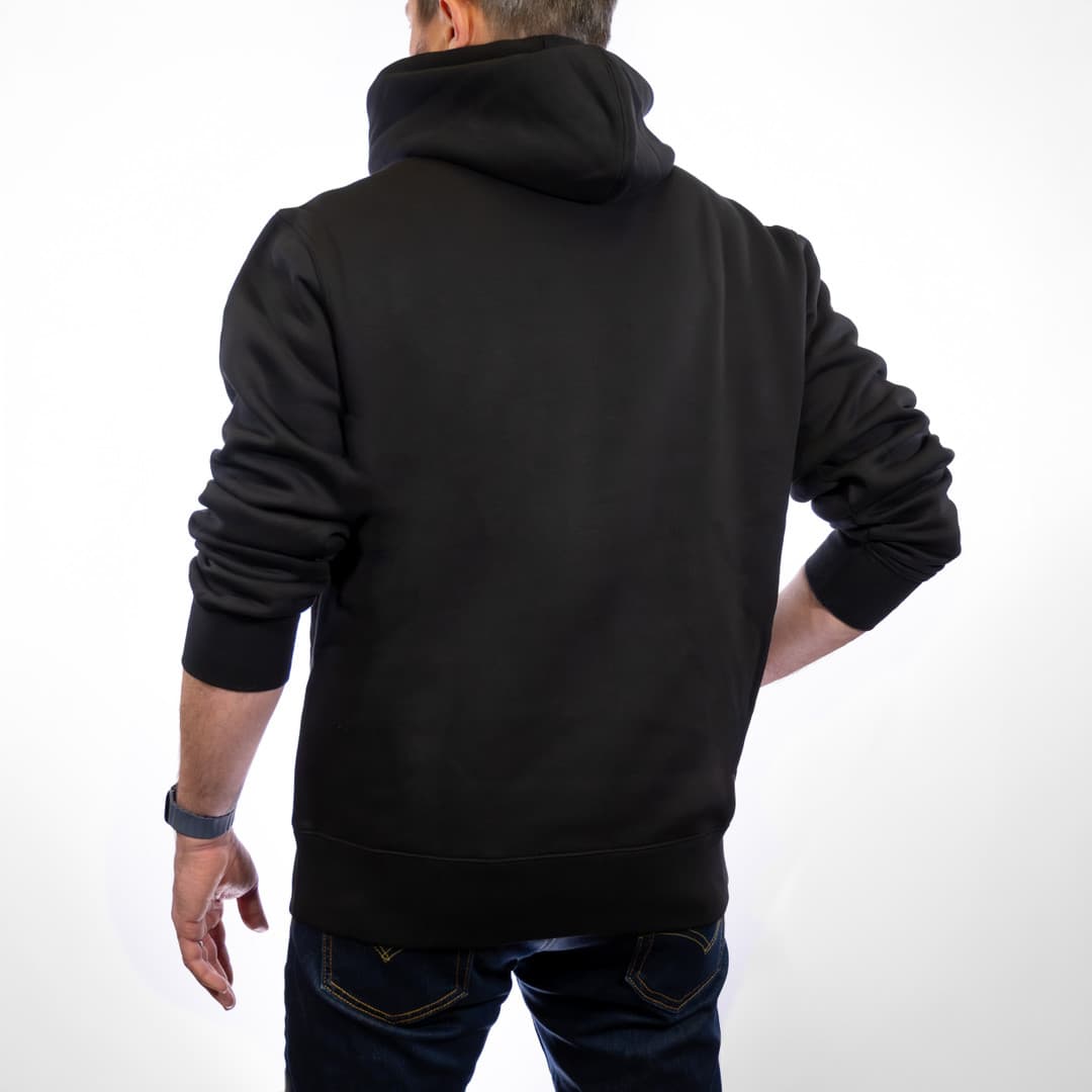 • Heavy-duty black pullover hoodie made from 100% cotton